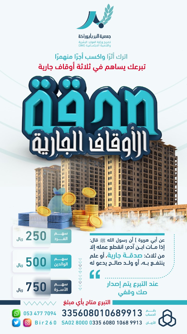 https://www.maryamabnatimran.com/for...1&d=1656694020 مشروع صدقة الأوقاف الجارية، تساهم في ثلاث أوقاف جارية. تذكر الحديث: إذا مات ابنُ آدمَ انقطع عملُه إلا من ثلاثٍ: صدقةٍ جاريةٍ، وعلمٍ ينتفعُ به، وولدٍ صالحٍ يدعو له. الراوي:- | المحدث: ابن تيمية | المصدر: مجموع الفتاوى | الصفحة أو الرقم: 1/191 | خلاصة حكم المحدث: صحيح. التبرع مفتوح التبرع: اضغط هنا |