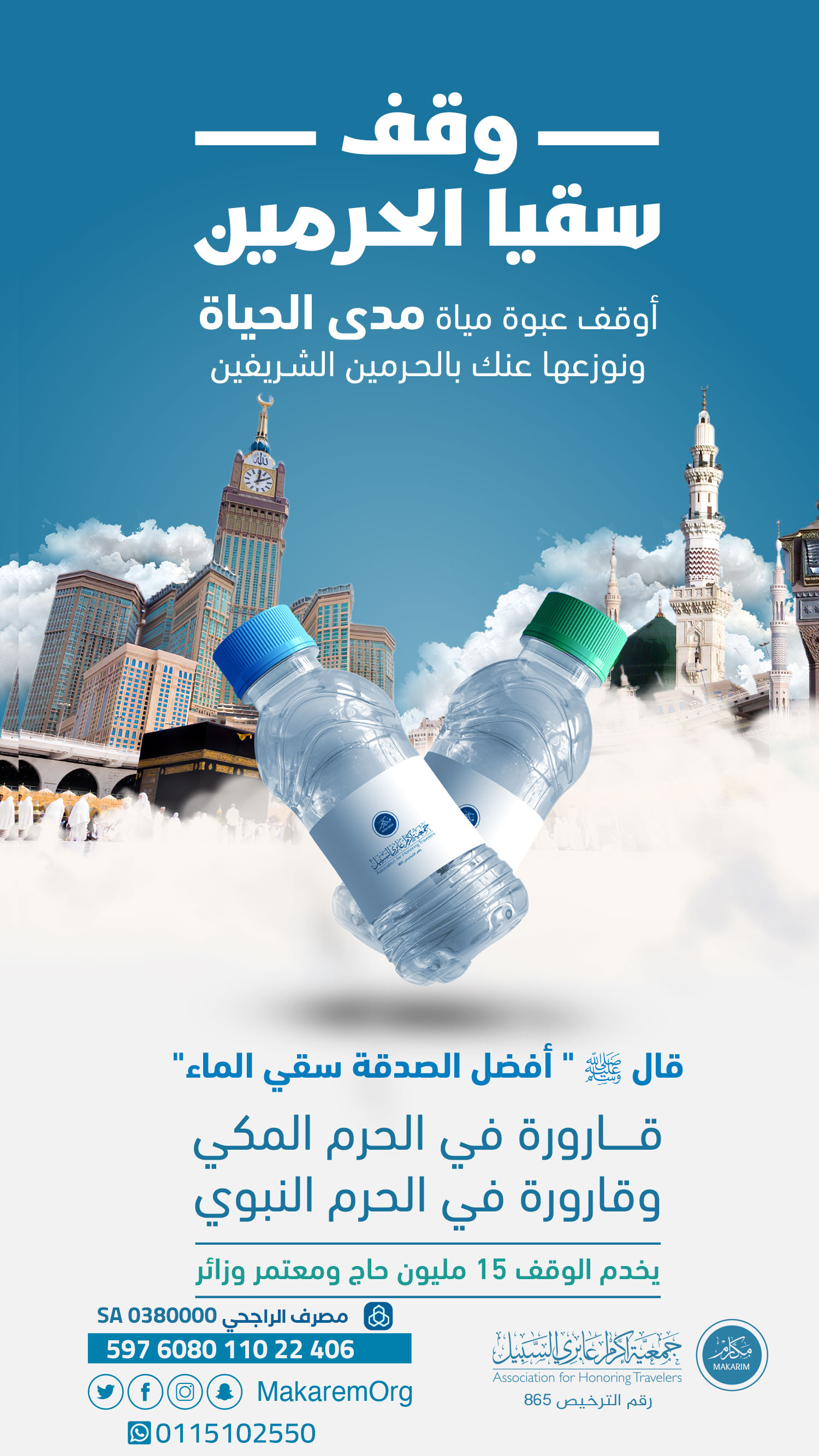 أوقف عبوة ماء مدى الحياة في وقف سقيا الحرمين لتنعم بالأجور المضاعفة من داخل حد الحرم.