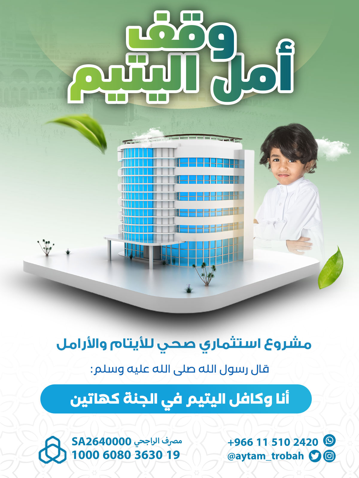 وقف أمل اليتيم هو مشروع استثماري صحي يعود ريعه للأيتام والأرامل وأسرهم، فرصتك لكفالة يتيم مدى الحياة وتوفير الرعاية الصحية للأيتام وأسرهم.