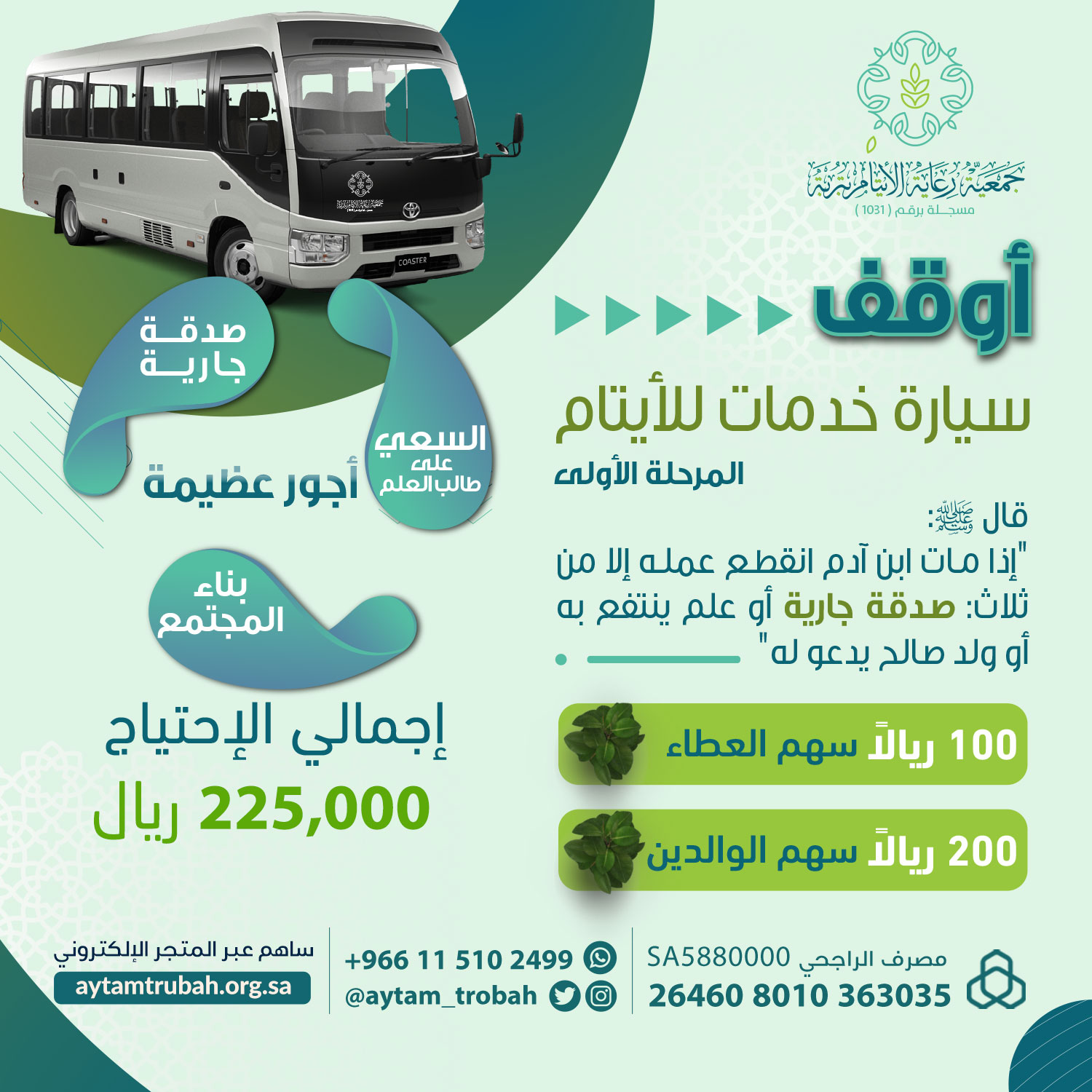 السلام عليكم ورحمة الله وبركاته أوقف سيارة للأيتام فز بأجر كفالة الأيتام والأرامل والسعي على طالب العلم وأجر الصدقة الجارية. صدقة جارية عنك وعن والديك ومن تحب فاغتنها ولا تضيعها. صدقة جارية عنك وعن والديك ومن تحب. أجر كفالة الأيتام والأرامل والسعي على طلب العلم وأجر الصدقة الجارية. فرصة نادرة لتنال أجر وثواب عظيم. عن أبي هريرة رضي الله عنه، عن النبي صلى الله عليه وسلم قال "الساعي على الأرملة والمسكين كالمجاهد في سبيل الله"، وأحسبه قال: وكالقائم الذي لا يفتر، وكالصائم الذي لا يفطر، متفق عليه. وقف سيارة الأيتام لخدمة الأيتام والأرامل وأسرهم. التبرع: اضغط هنا |
