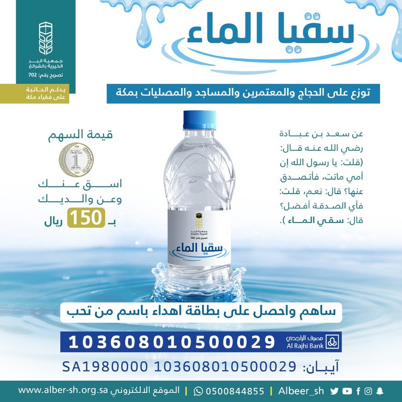 السلام عليكم ورحمة الله وبركاته دعت جمعية البر الخيرية بالشرائع بمكة المكرمة المحسنين للمساهمة بالتبرع في مشروع "سقيا الماء" بما تجود به أنفسهم، ولو بريال واحد؛ ليروي عطش حجاج ومعتمري بيت الله، وفي المشاعر المقدسة، والعاملين في موسم الحج من رجال الأمن وأبطال الصحة وجميع الجهات المشاركة بتوزيع السقيا من خلال عبوات ماء مبردة، واغتنام فضل العشر المباركة، وشرف المكان والزمان. وأوضحت أن طريقة المساهمة تتم عبر التحويل عن طريق الحساب المخصص للمشروع في مصرف الراجحي برقم الحساب: 103608010500029 وعبر البنوك الأخرى: SA1980000103608010500029 |